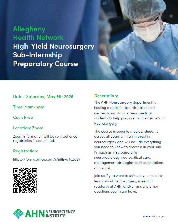 Thank you for your interest in becoming a student of the Allegheny Health Network (AHN) Neuroscience Institute, Department of Neurosurgery. Neurosurgery is one of the most invigorating and challenging surgical sub-specialties.
